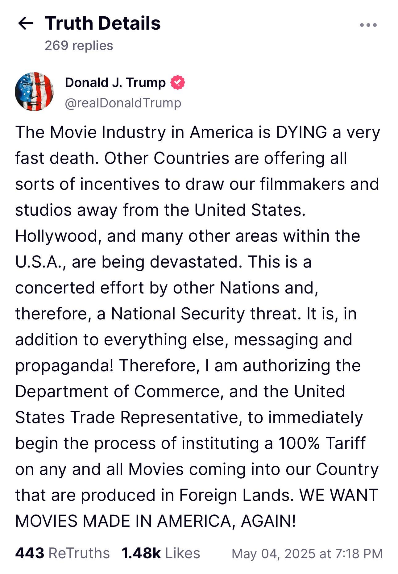 Trump has made it clear that he isn’t a fan of foreign films. I mean, clearly, he isn’t a fan of anything made outside the US, but back in 2019 when the South Korean film “Parasite” won Best Picture at the Oscars, his reaction was “What the hell was that all about? Can we get ‘Gone with the Wind’ back please?” which pretty much tells you all you need to know about the President’s movie taste. His declaration of the proposed tariff on films made in “foreign lands” came through a social media post, where he claimed it would be necessary to save the country’s film industry (it really wouldn’t).