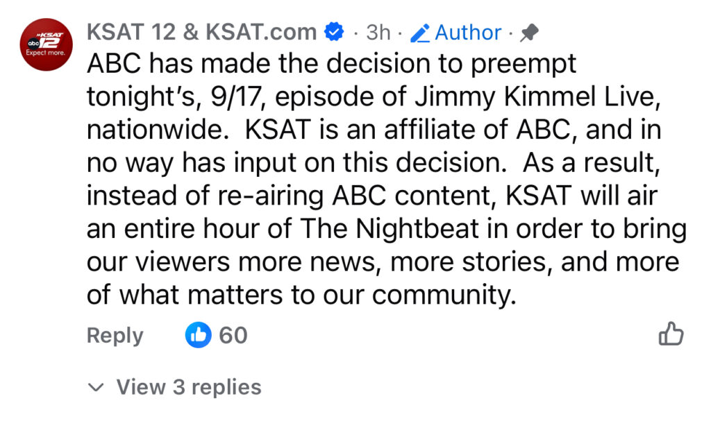 “ABC has made the decision to preempt tonight’s, 9/17, episode of Jimmy Kimmel Live! nationwide. KSAT is an affiliate of ABC, and in no way has input on this decision. As a result, instead of re-airing ABC content, KSAT will air an entire hour of The Nightbeat in order to bring our viewers more news, more stories, and more of what matters to our community.”