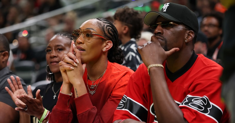 Las Vegas Aces forward A’ja Wilson and boyfriend Miami Heat player Bam Adebayo watch the three-point contest during the 2025 WNBA All Star Skills Challenge at Gainbridge Fieldhouse. Trevor Ruszkowski-Imagn Images