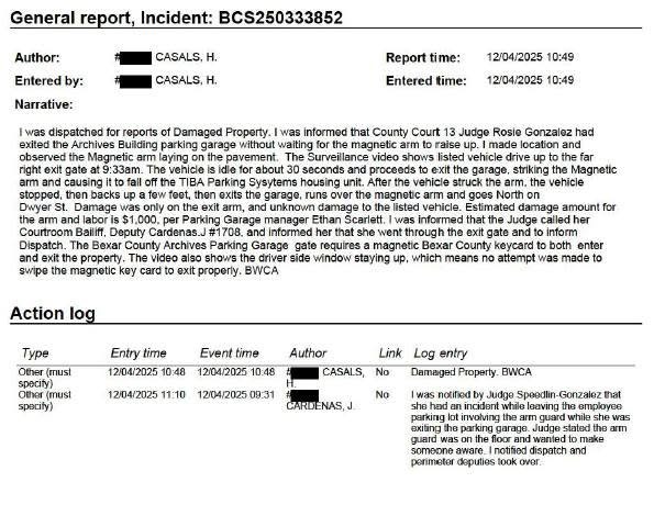 Weeks before her indictment on felony and misdemeanor charges, Bexar County Judge Rosie Speedlin-Gonzalez was involved in a separate incident involving damage to county property, according to a December 4, 2025 Bexar County incident report.