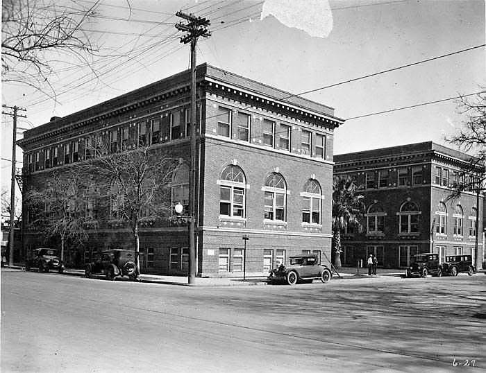 1927 – YWCA, 403 Fifth Ave. Photo shows the west and south elevations of the brick building, designed by architects Adams and Adams and located on the northeast corner of Broadway and 5th St (later McCullough Ave). Photo: FB