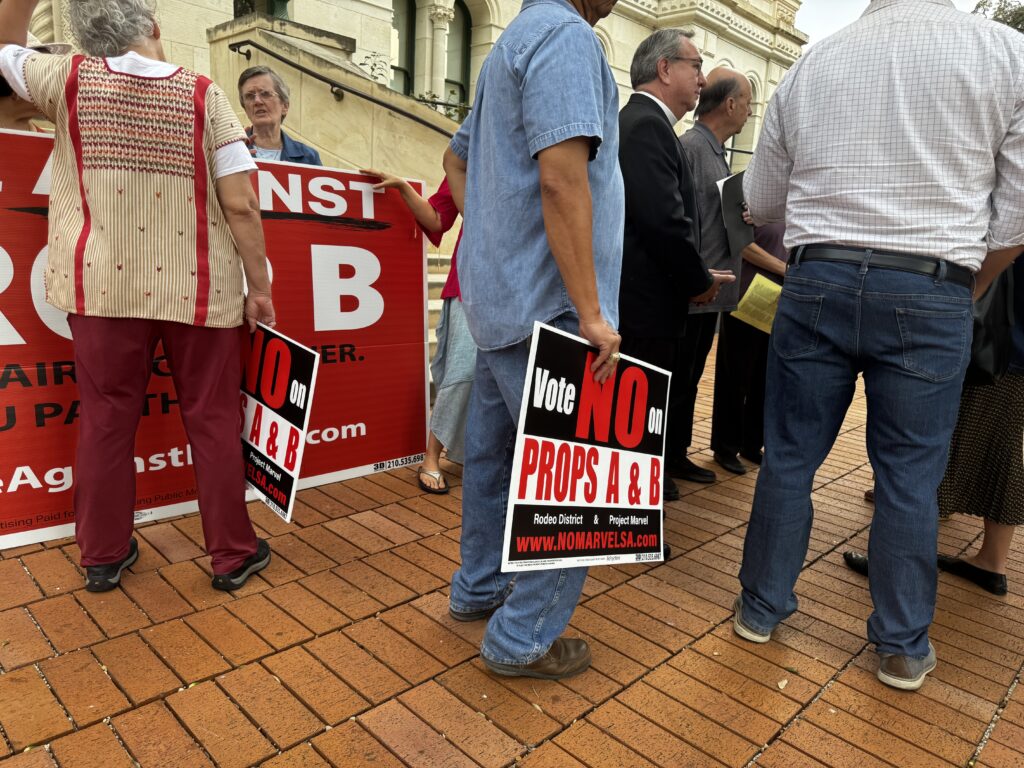 “It is false to claim that Prob. B will not affect our taxes,” Duestrecht said, holding up a sample ballot. “It says right here—this is a tax increase. This will cause a domino effect of hundreds of millions in taxpayer dollars: $250 million for infrastructure and parking, $60 million from diverted general funds, $200 million to move the SAWS chill plant, and $600 million in arena renovations—all from unknown sources that we’ll ultimately pay for.”