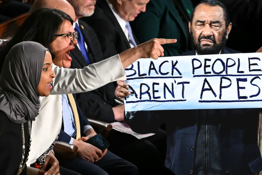 Texas Congressman Al Green held up a sign reading “Black people aren’t apes,” referencing a racist video posted on Trump’s social media account earlier this month depicting former President Barack Obama and former First Lady Michelle Obama as apes. Green was escorted out of the chamber. He had also been removed during a prior address for protesting.