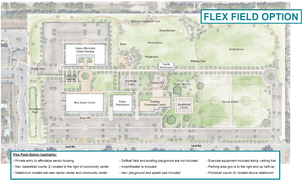 The survey presents three conceptual master plan options, each offering a different layout for the senior center, park space, housing, parking and recreational features. Residents are encouraged to review each option, select the plan they prefer most, note the one they prefer least and share additional feedback.