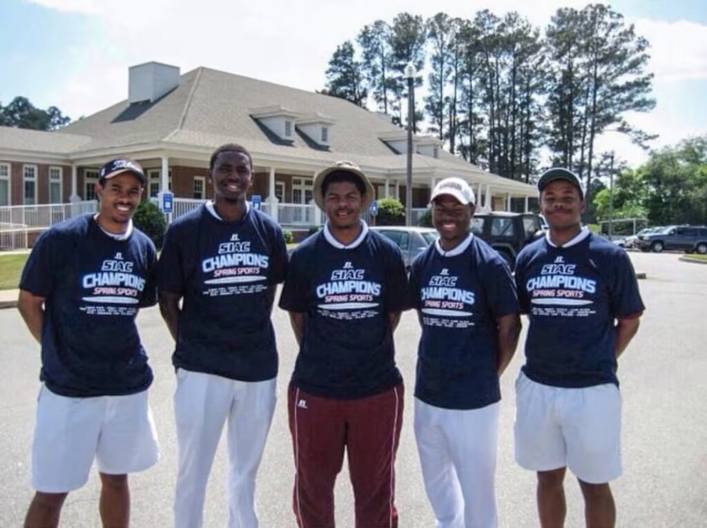 Olajuwon Ajanaku, second from left, Earl Cooper, third from left, and other former members of the Morehouse College golf team after winning the Southern Intercollegiate Athletic Conference Golf Classic in 2010. Eastside Golf