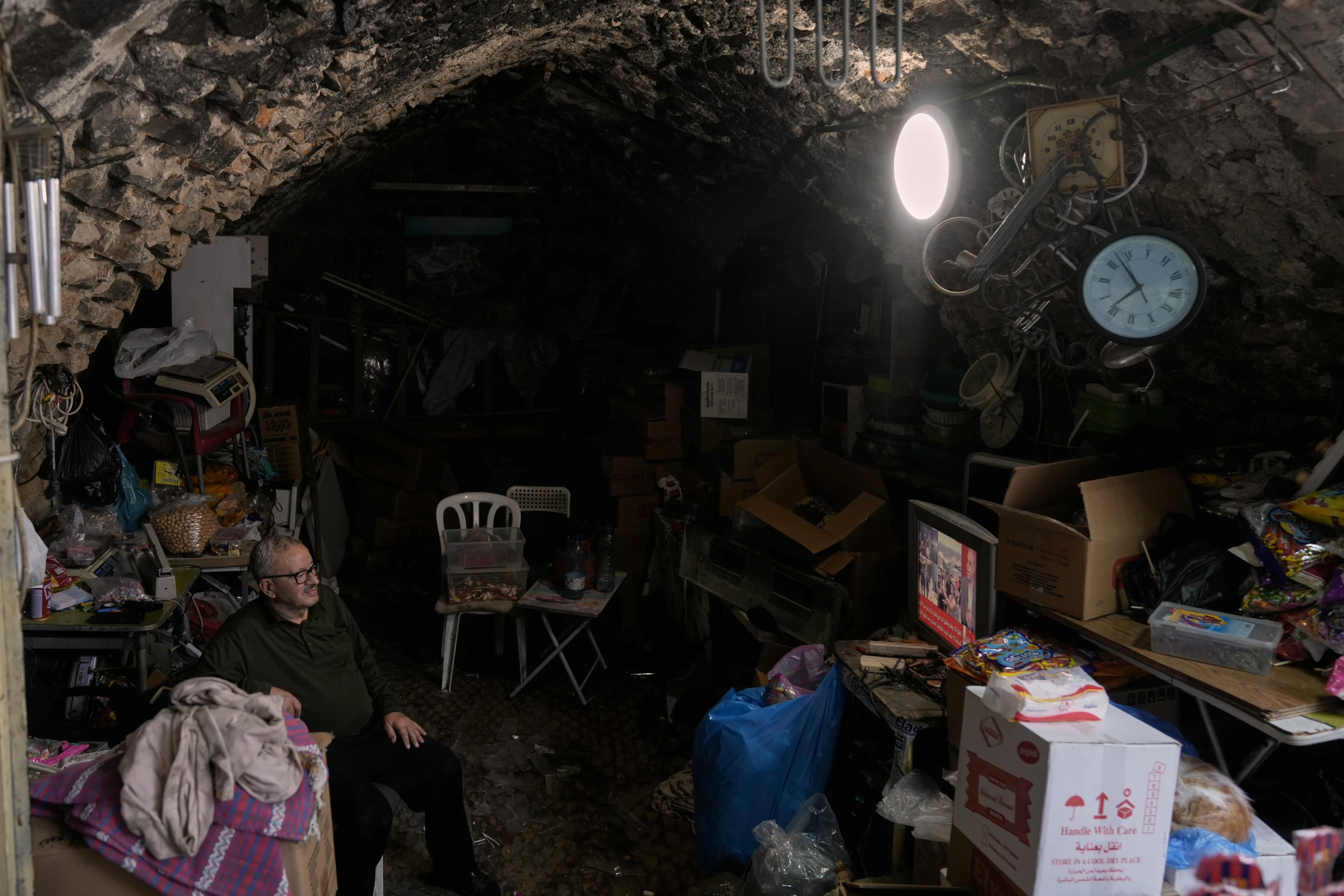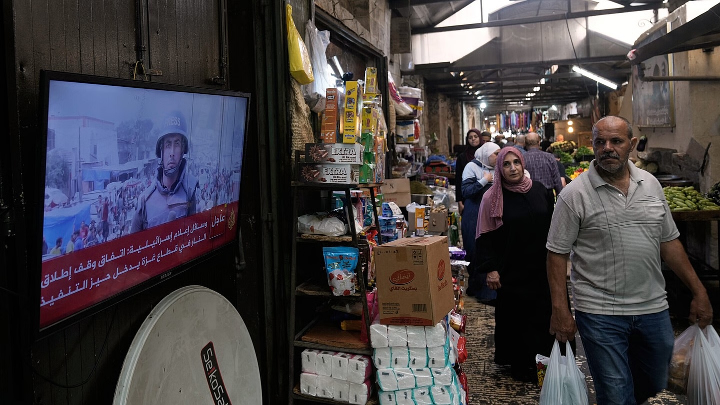 A street vendor watches the news on television after the announcement that Israel and Hamas have agreed to the first phase of a peace plan to pause the fighting, as he sits in his shop, in the Old City of Nablus, in the West Bank, Thursday, Oct. 9, 2025. (AP Photo/Majdi Mohammed)