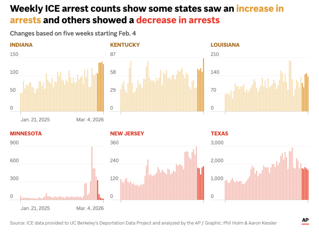 ICE arrests rose significantly in Kentucky, Indiana, North Carolina and Florida during those five weeks, in some cases hitting their highest weekly count since the start of Trump’s second term.. In Kentucky alone, weekly arrests more than doubled, reaching 86 by early March.