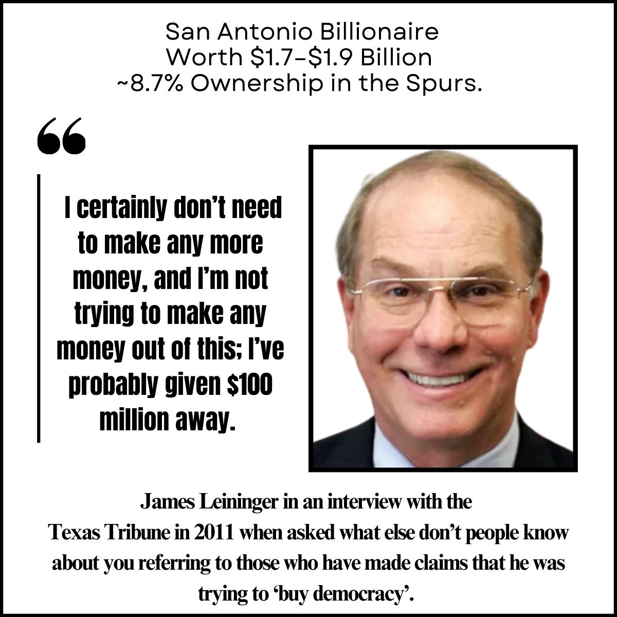 • James R. Leininger — San Antonio billionaire, worth $1.7–$1.9 billion (~8.7% stake in Spurs)
