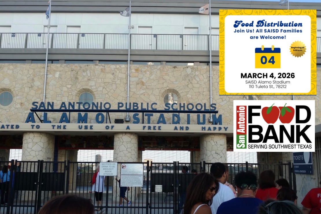 On Wednesday, March 4, from 9 a.m. to 11 a.m., SAISD students and employees will volunteer at Alamo Stadium, located at 110 Tuleta Drive, to distribute food to approximately 800 families.