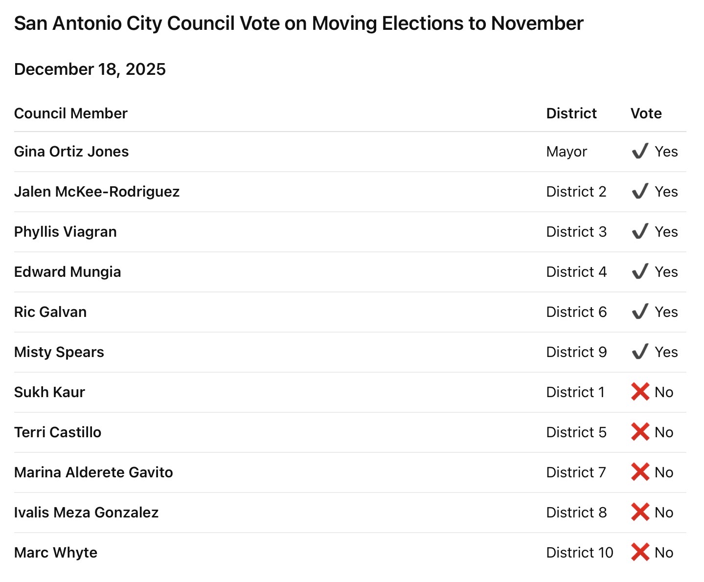 The six members who voted in favor of the change included Mayor Gina Ortiz Jones and councilmembers from across the political spectrum, illustrating a rare cross-aisle compromise on a major governance issue.