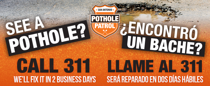 “You drive, walk and bike on our streets each day,” the department notes. “Help us keep our roadways free of potholes—report them to 3-1-1 or 210-207-6000 as soon as you find them. The more potholes you report, the more potholes we can repair.”