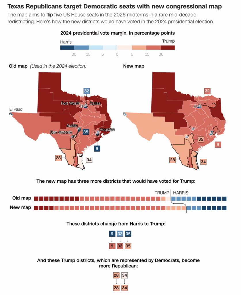 Democrats have filed multiple lawsuits, arguing the maps unlawfully weaken minority voting power in violation of the Voting Rights Act. A three-judge federal panel in El Paso has scheduled a preliminary injunction hearing for October 1–10.