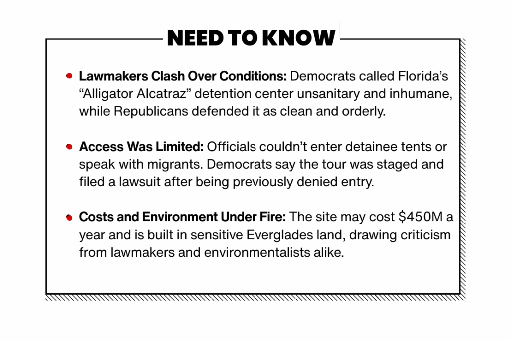 A group of state and federal lawmakers toured the newly built immigration detention center in Florida’s Everglades—nicknamed “Alligator Alcatraz”—over the weekend, and their reactions exposed sharp partisan divisions over the facility’s purpose, conditions, and legitimacy.