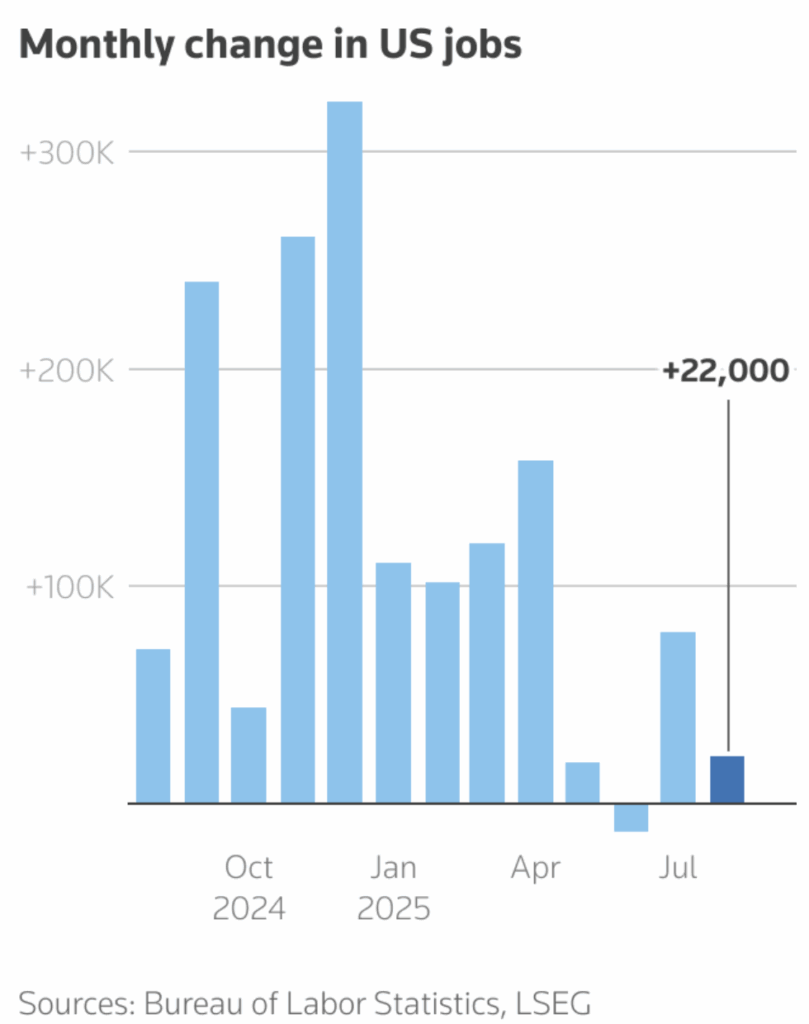 The Labor Department reported just 22,000 jobs were added in August, far fewer than economists’ forecast of around 75,000. Revisions showed payrolls in June actually declined by 13,000, the first monthly loss since late 2020, while July’s count was revised upward to 79,000.