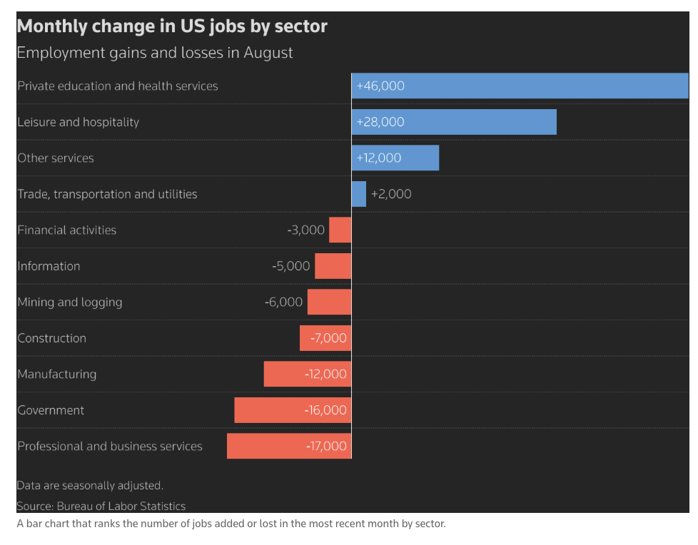 Healthcare added 31,000 positions in August and social assistance rose by 16,000, but both increases were below their 12-month averages. Federal government payrolls dropped by 15,000, while wholesale trade, manufacturing, construction, and professional services also shed jobs.