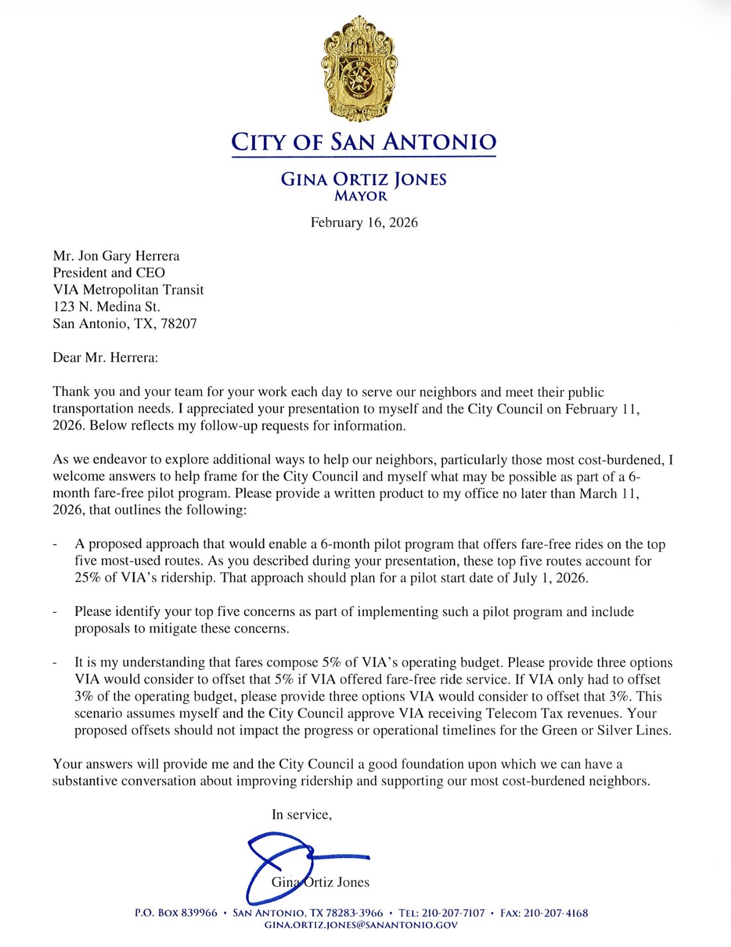 In a February 16, 2026 letter to VIA President and CEO Jon Gary Herrera, the Mayor asked VIA to outline how such a pilot could be structured, including a potential July 1, 2026 start date.