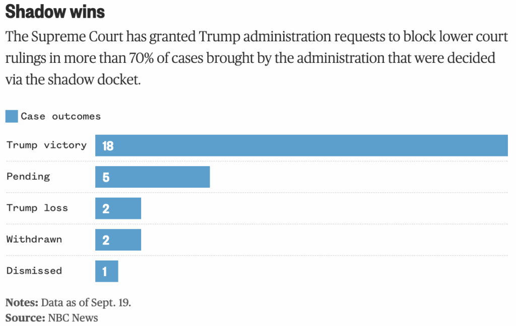 The administration has sought emergency intervention from the Supreme Court 28 times, losing only twice. Those defeats came in immigration cases: one blocking the use of the Alien Enemies Act for deportations, and another requiring the U.S. to return Kilmar Abrego Garcia after a wrongful deportation.